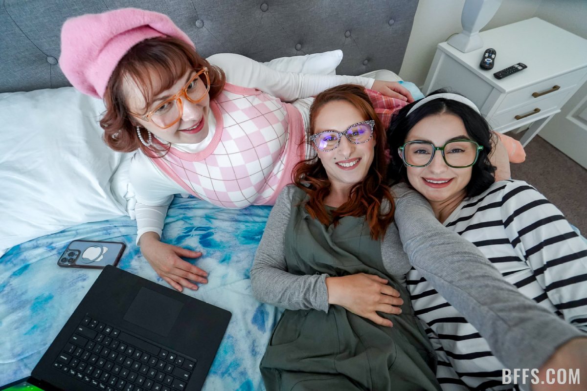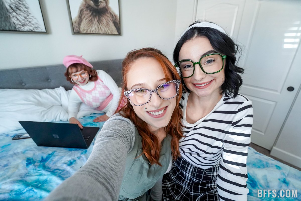 Nerd BFFs Alice, Stevie and Ava are catfishing online. According to wikipedia its: “a deceptive activity where a person creates a fictional persona or fake identity on a social networking service, usually targeting a specific victim”. And they are doing exactly that.. using a picture of a hot supermodel they are talking to David. He is one of many but he does really shows up at their house. He is pretty surprised to find three nerdy bffs. Ava Sinclaire, Alice Marie and Stevie Moon are more than happy about their latest catch. And it seems like David doesn’t minds the kinky geeks. He just wants to have fun and dive deep in these beautiful chicks. The feeling is mutual, so everything is set up for a nice foursome. Enter below to grab the almost hour long BFFs sex party video.