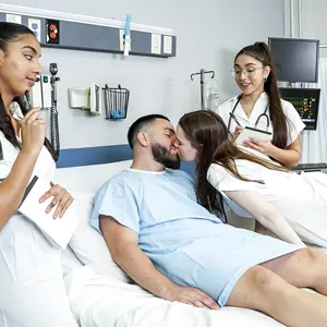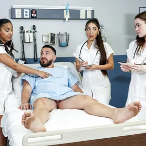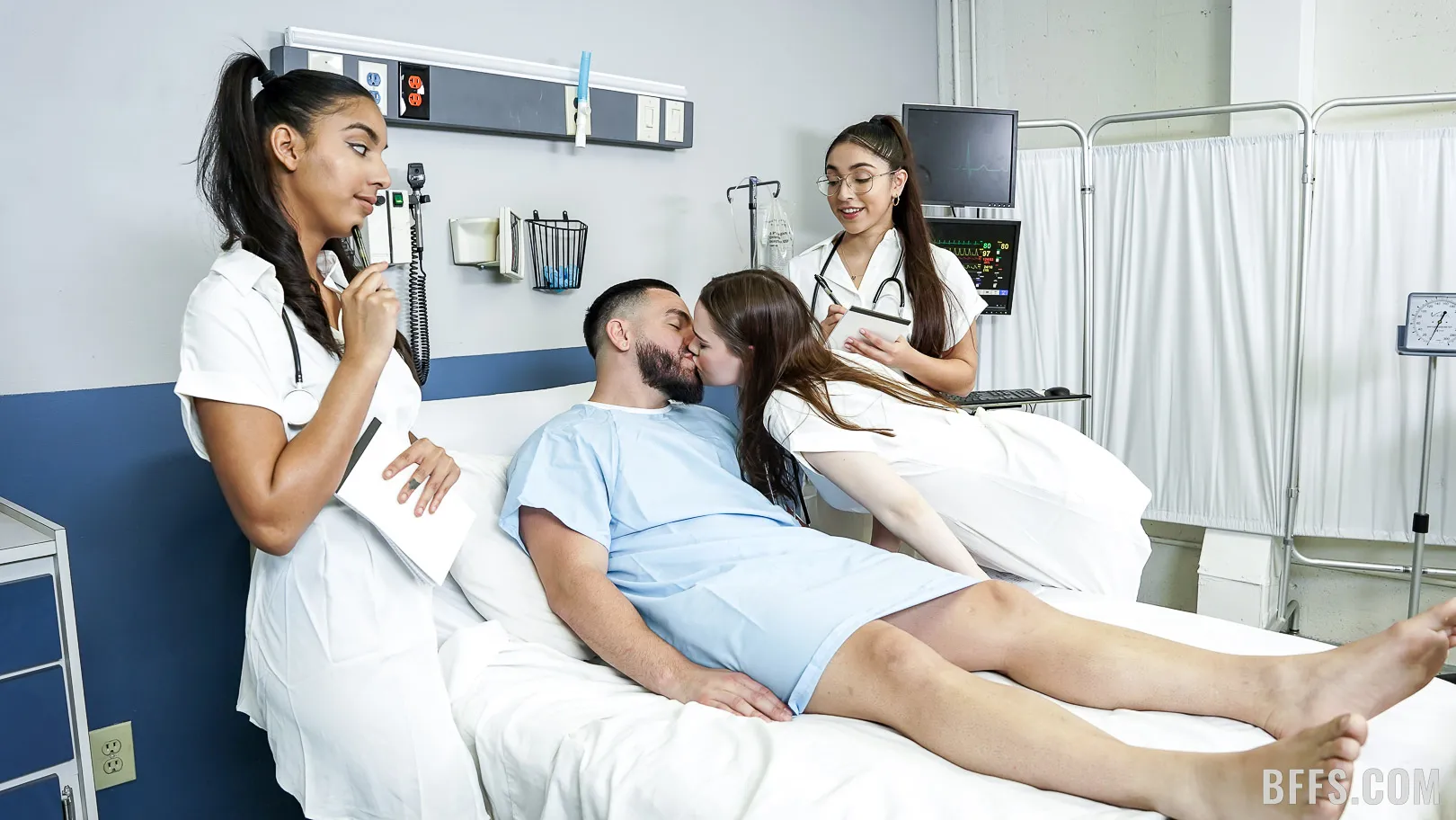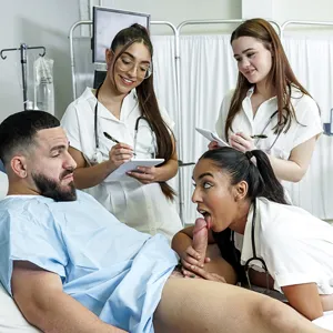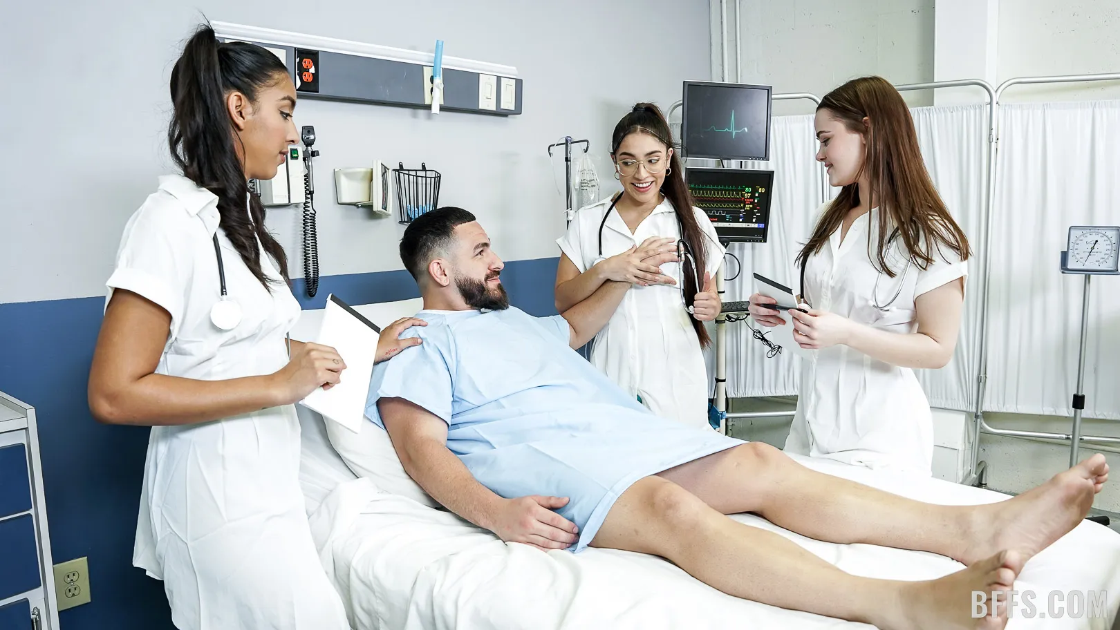 Trained medical professionals Claire Black, Madison Wilde and Trinity Olsen are ready for a special check up. Their next patient is the handsome guy Peter Green. The first thing they want to know if Peter is single. Then Dr. Madison puts his hands on her boobies to see if it makes his dick hard. It’s a win! They can move to the next step. To the foursome oral session, nicely blowing that fat dick one by one. Once it’s super hard Dr. Trinity is the first to get on top.. then followed by all the horny doctors to get a good ride! BFFs Doctor, Doctor, Doctor! is available now for streaming and download in 4K. Get it below!