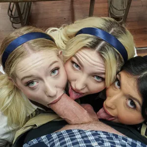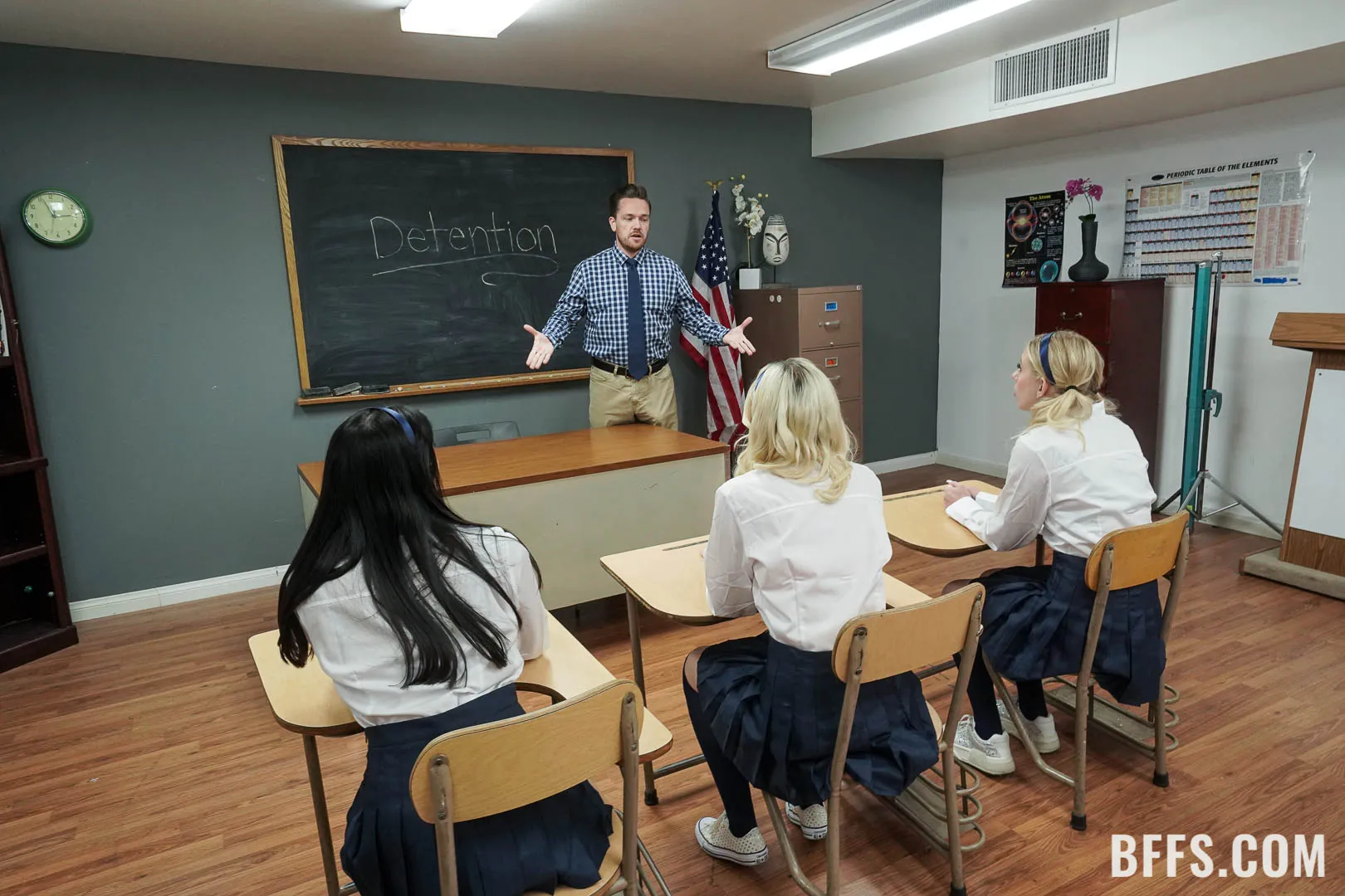 Naughty classmate BFFs Kallie Taylor, Britt Blair and Penelope Woods are having fun in the classroom. They are pulling down their skirts and panties in front of the blackboard to take some super sexy selfies. Chicks just love to get naughty in the school. The same has happened in the previous BFFs after school detention with the spicy Latina teacher. But today it’s different. They got teacher called Kyle in detention and he is a strict fella. At least till his dick isn’t out. What is definitely a party changer. It’s thick and will be more than enough for Kallie, Britt and Penelope. They are going to feast on their teachers big cock and swap cum in the end! BFFs Good Girls Gone Wild is out now in 4K. Make sure to bookmark this page because we will update it with hot pictures after the release!