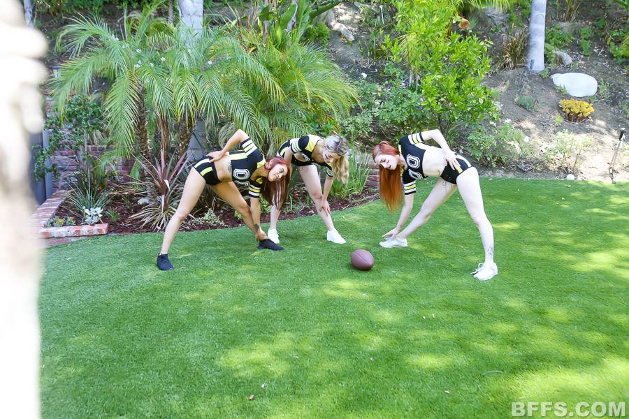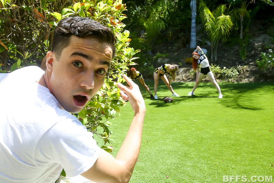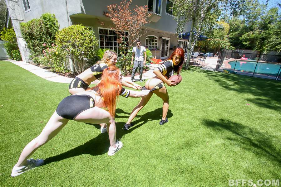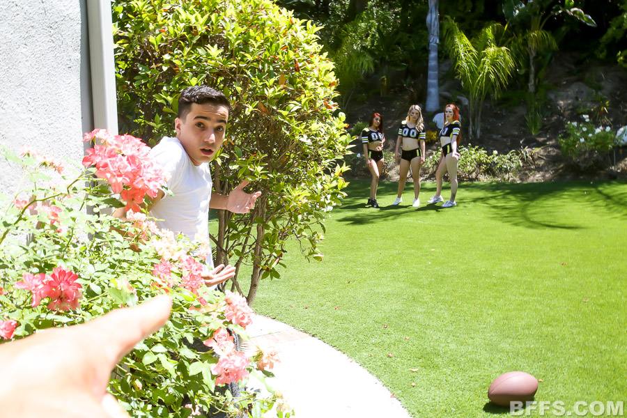 Flag football training is going on in the backyard with Abby, Aria and Amber. The three besties dressed up in their sexy uniforms are pretty serious about this whole exercise. But they all change their minds once Ricky shows up. The neighbor stud was peeking at the bffs but he got exposed once the ball landed near him. He returned the ball as a true gentleman and offered his help to the ladies. But they aren’t looking for any help, they just want a fine hard cock. And our friend Ricky can provide them with one. They quickly moved indoors so our stud can release his cock for the tittsburgh feelers. They all wanted to taste it, but Amber is looking forward to eat some pussy as well! It all ended in a hot bffs foursome cock sharing party! It looks like Ricky definitely knows how to score!