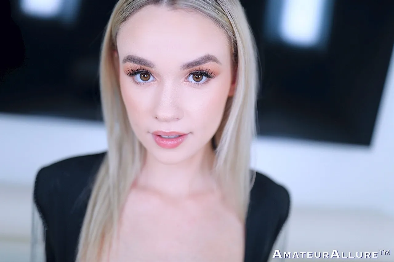 Khloe Kingsley returns to Amateur Allure only after 2 months. She made her debut in February but she is already here for more cock sucking and riding! This time she is going to enjoy Codey Steele’s rock hard dick. First inside her pretty mouth and deep down her throat. That beautiful face of hers can take a big dick with no issues. But then her juicy hairy pussy is on the line. She just likes to bend over and get fucked balls deep. But of course the creamy load is going down her throat in the end!