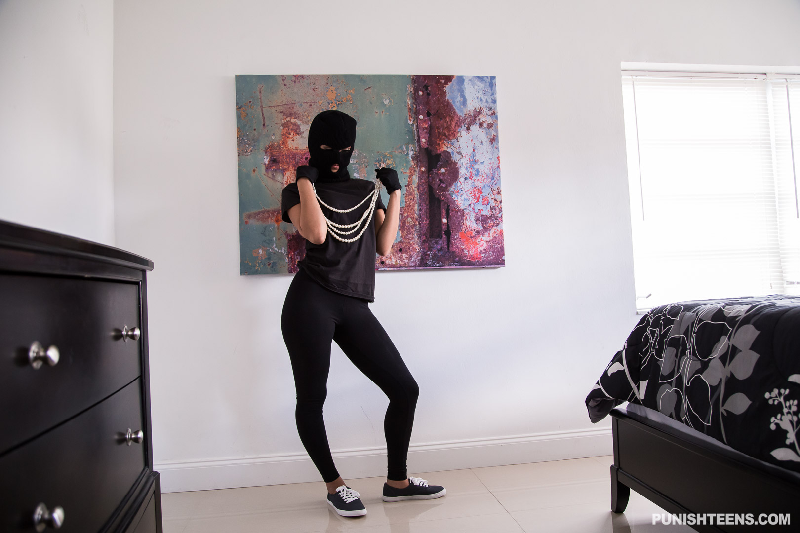 Meet the kinky burglar couple Sophia and Bruno who have been stealing stuff from the neighboring houses for quite some time now. However today they got into a house where some sexy bondage equipment was left behind, so after grabbing all the expensive jewelry they are ready to give the whips a chance. The gorgeous Latina chick strips down to show off her amazing butt then she gets tied down, so she can blow Bruno’s hard dick and get fucked afterwards on the sofa. They love it as much as we do!