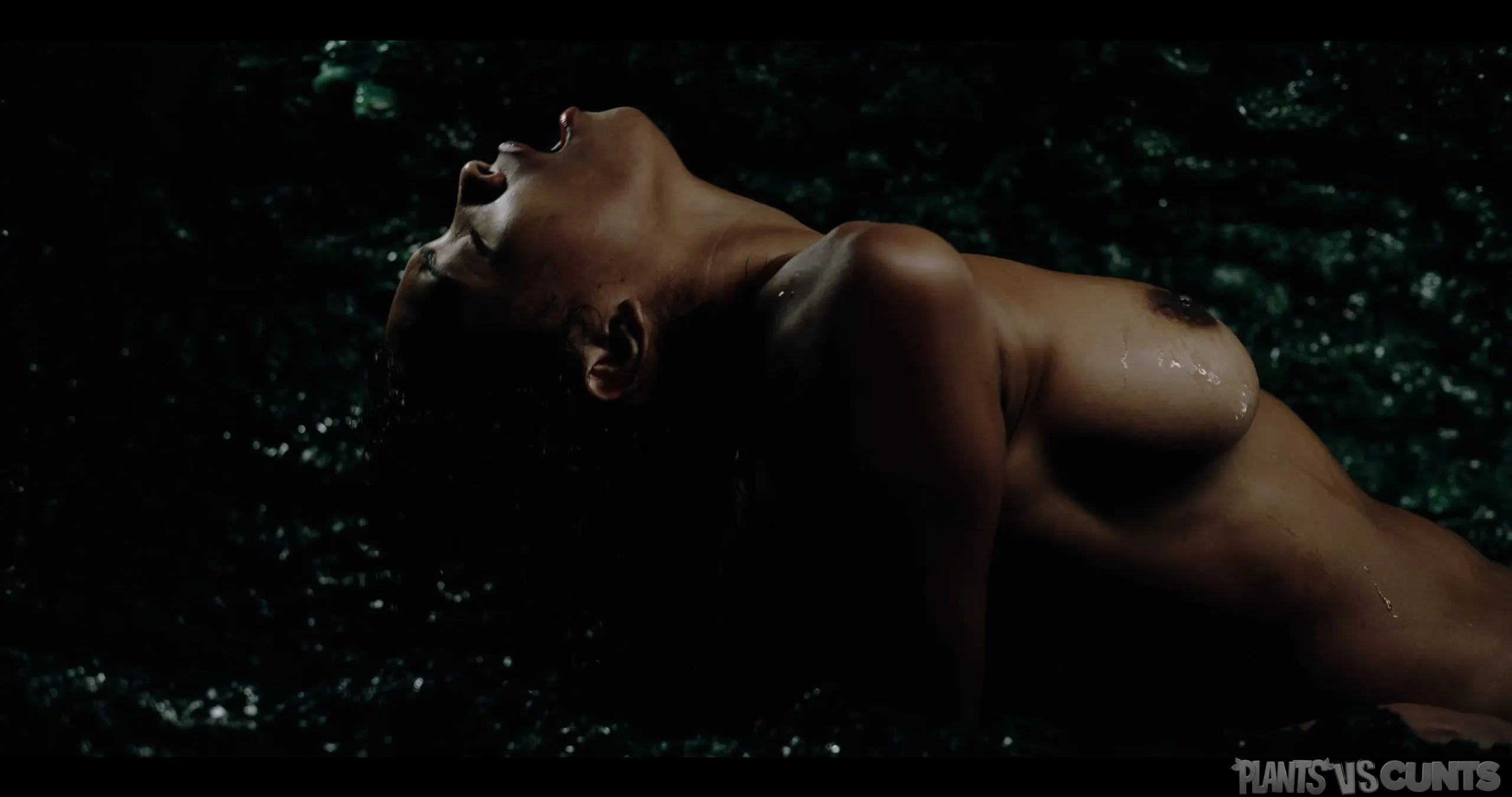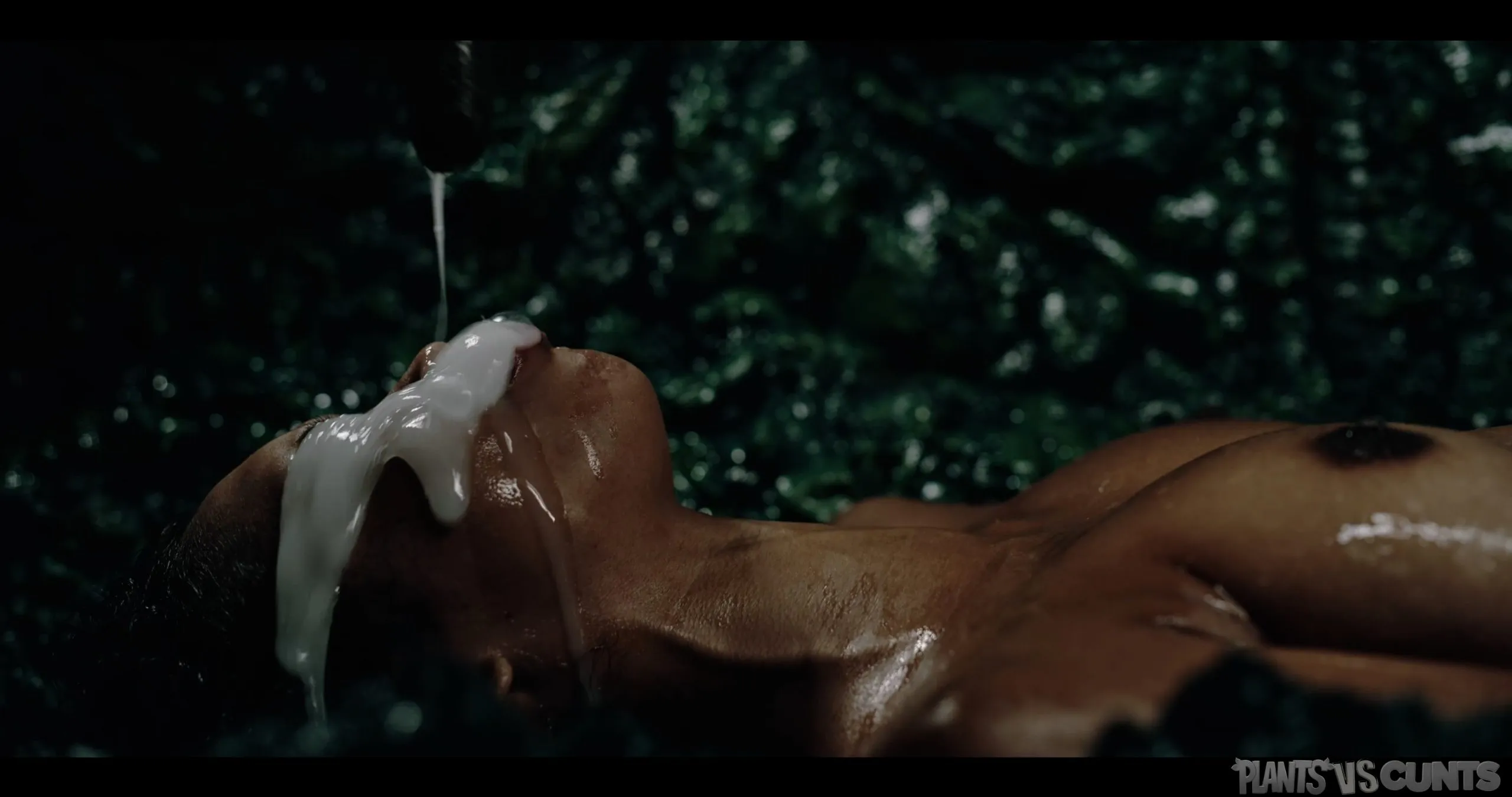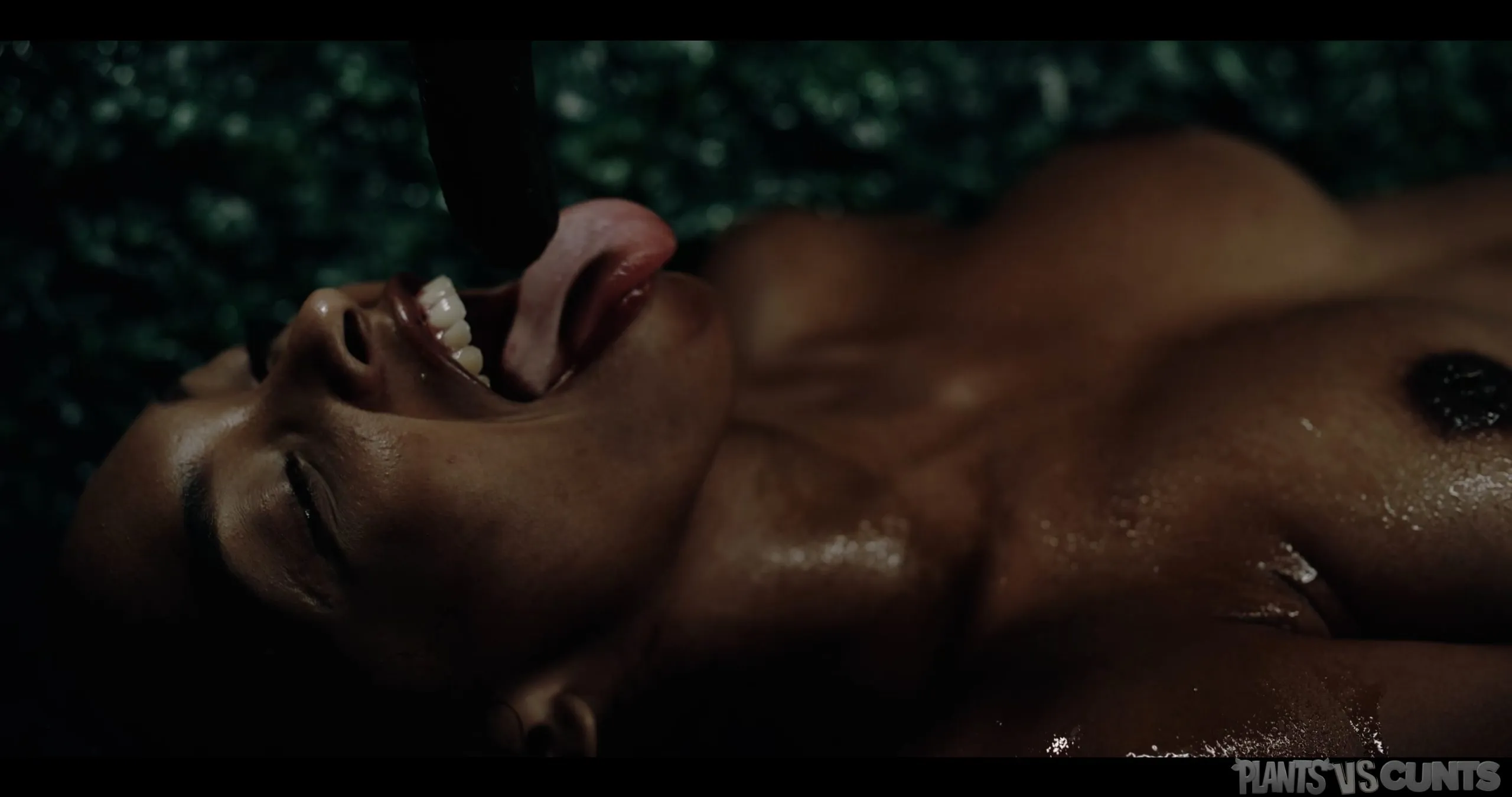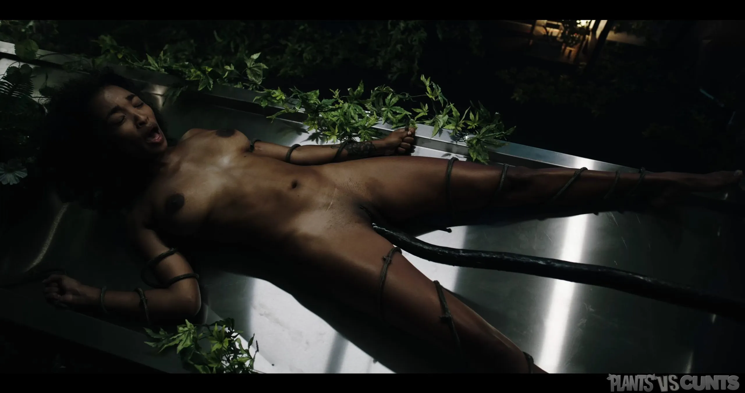 Barbie Rous is working hard in the lab. Her new experiment is about enhancing the growth of a beautiful flower and it seems to be working. Actually the whole lab is filled now with branches and vines. And with a big flower in the middle. But our sexy lab beauty gets sprayed by it, making it her pass out. She wakes up all nude laying on the lab desk. Her legs and arms are wrapped in vines. Barbie Rous is perfectly positioned in the middle of the table so one of the plant tentacles can freely ride her juicy black pussy. But her mouth gets an other tentacle too. Loading this black big tit with cum in her holes.