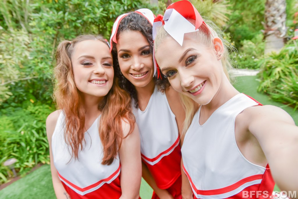 This is going to be a though competition. It’s time to decide who is going to be the new cheerleading captain. Our lovely cheerleader BFFs Emma, Gia and Lily are going to compete and the coach is going to decide who gets the role. They need to show off their best moves one by one. But instead they decide to work together as a real besties team. They all get on their knees and reach for coach’s already hard cock.