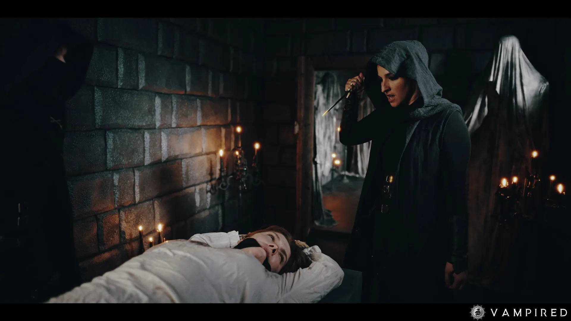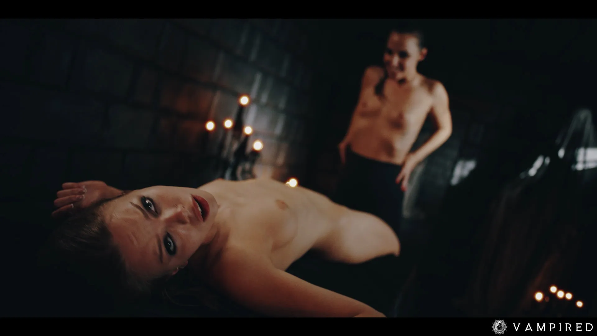 Secret legion member Amirah Adara is summoned by the legion itself. She appears in a undisclosed location in her uniform. Amirah is greeted by Ashby Winter who is an other member of the legion. It turns out she has overcome the trials and she is really close to becoming a full fledged member of the legion! Amirah needs to do one more. An innocent victim Sata Jones is bound to a table and her mission is to execute her. But instead of killing her she sets Sata free. Then she gets bitten and turned into a Vampire. And the rest is history.. filled with wild scissoring and vampire pussy eating!
